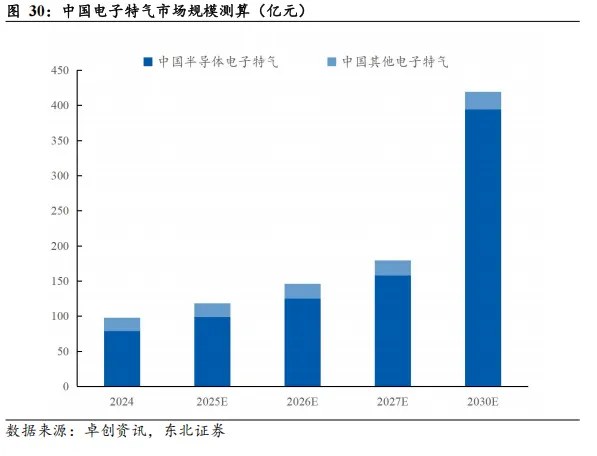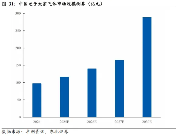 而电子大宗气体作为半导体制造过程中的保护气、环境气、运载气、清洁气,或也将随着先进制程和堆叠存储的扩产而呈现非线性增长态势。经我们测算,中国电子大宗气体市场规模有望在2030年达到288亿元。