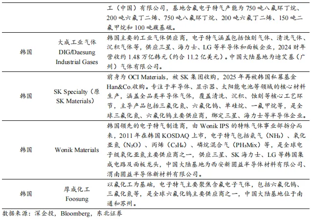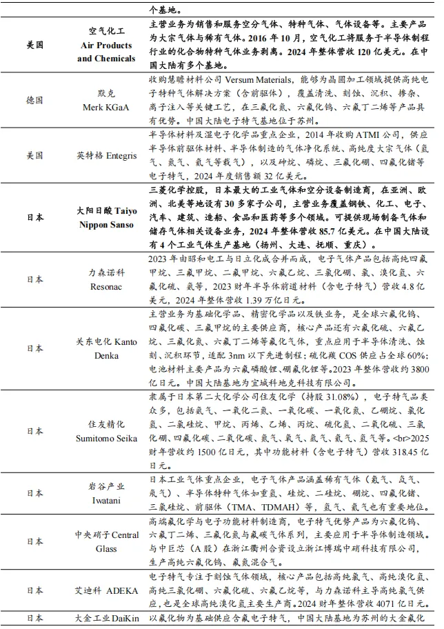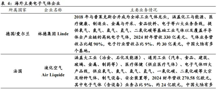 外资企业高度垄断,全球格局较为集中。电子气体市场的竞争生态复刻工业气体行业的强者恒强逻辑,呈现出以欧美日企业为主导的寡头垄断态势。据中国电子材料行业协会,德国林德集团、法国液化空气、日本大阳日酸及美国空气化工这四大国际巨擎,凭借先发优势合计攫取全球逾七成的市场份额。此外,德国默克、日本力森诺科(原昭和电工)、韩国SK Materials、日本关东电化、日本住友精化、韩国 Wonik Materials及美国英特格等细分龙头,亦在电子特气领域具备深厚的技术护城河。