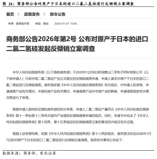 日产二氯二氢硅遭反倾销调查,供应链重塑有望加速国产突围。2026年1月7日,商务部公告对原产于日本的进口二氯二氢硅进行反倾销立案调查,审查范围覆盖2024年下半年至2025年上半年的倾销行为及过去三年的产业损害情况。二氯二氢硅属于电子特气的一种,主要用于集成电路芯片制造过程中的薄膜沉积,用于生产逻辑芯片、存储芯片、模拟芯片和其他类芯片,也可用于合成硅基系列前驱体和聚硅氮烷等,此前长期依赖日本进口,此次贸易救济措施的落地势必抬升进口气源的成本与供应不确定性。在供应链安全与成本优化的双重考量下,下游晶圆厂将被迫加快验证本土供应商,为国内具备高纯气体产能的头部特气厂商打开极其宝贵的导入窗口与市场份额提升空间。