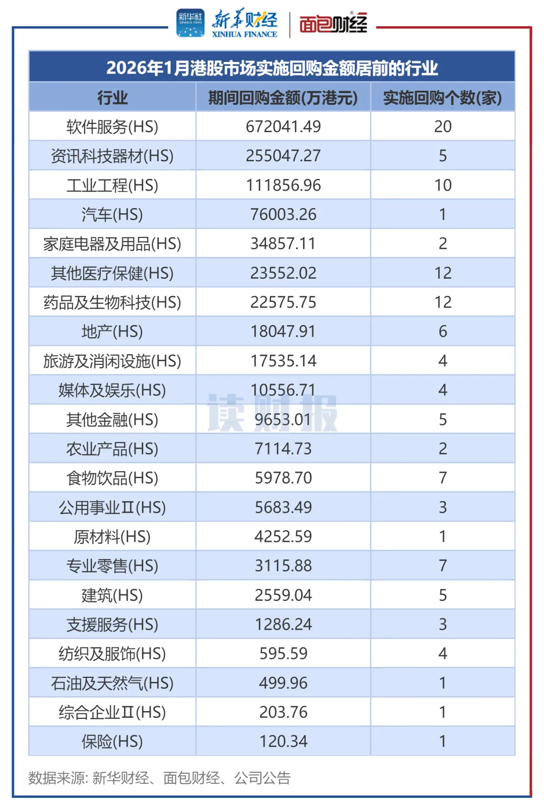 行业方面,2026年1月发起回购的港股上市公司,主要分布在软件服务、其他医疗保健、药品及生物科技等行业。