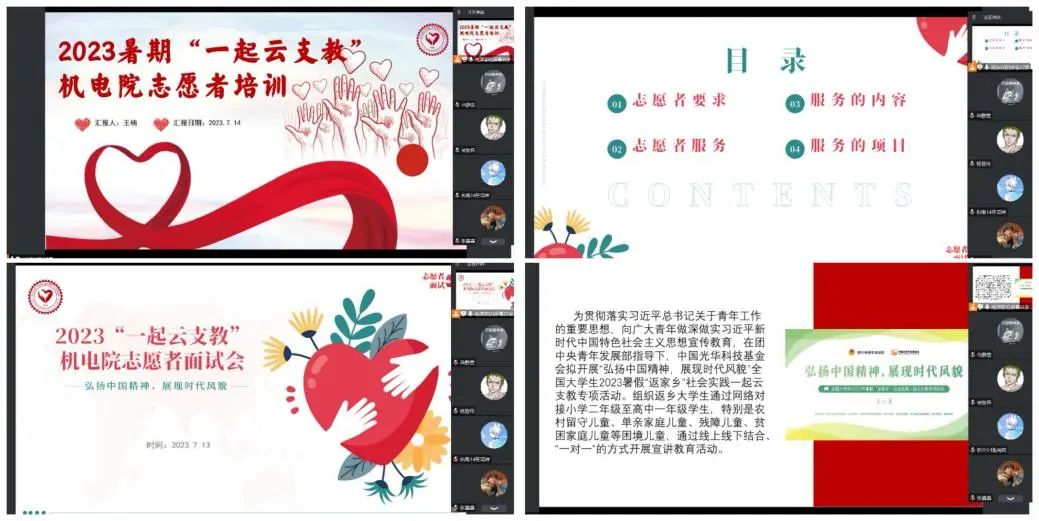 为进一步明确此次活动的工作要求、工作任务及具体工作流程,使志愿者明晰活动内容,保证云支教顺利开展,学院工作组前后于7月13日、7月14日召开了两次培训会。会上,负责人分别就云支教活动的四项基本任务要求、活动的开展形式、志愿时长的计算标准、信息查询系统使用方式等进行详细说明,并对志愿者提出的各项疑惑进行解答,为后续活动开展打下良好基础。