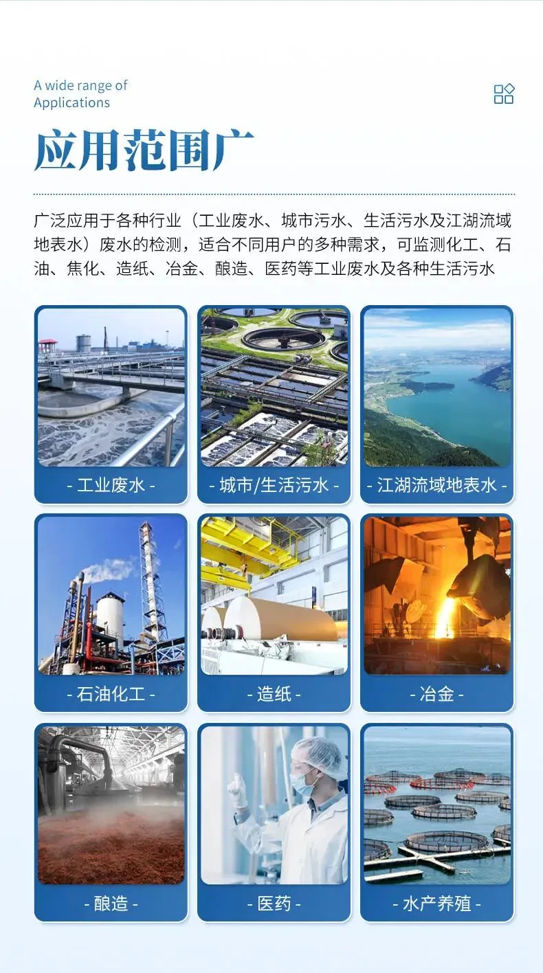 - 市政与环境监测:城市污水、生活污水处理厂、江河湖泊地表水监测。