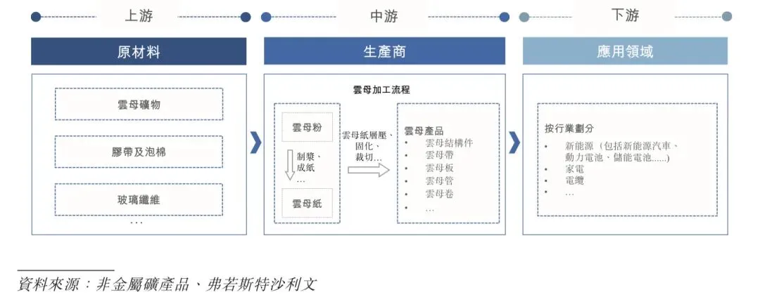 云母产品价值链包括上游原材料、中游生产以及下游应用领域。上游主要包括供应云母矿物、胶带及泡棉、玻璃纤维及其他材料。在中游,制造商将云母矿转化为云母粉,并通过制浆、成型和干燥等工艺进一步加工成云母纸。云母纸作为多种云母产品的核心基材,包括云母结构件、云母带、云母板、云母管及云母卷,这些材料通过层压、固化和切割工艺生产。在下游,这些产品被应用于多个领域,如新能源(主要是NEV、动力电池和储能电池)以及电缆、家电等其他领域。
