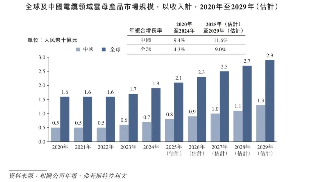 作为不可或缺的安全部件,随着电缆的运行电压进一步提高、产品更加轻量化,云母产品在电缆的应用将进一步增长。未来,根据弗若斯特沙利文的资料,2029年,全球电缆领域云母产品的市场规模将达到人民币29亿元,2025年至2029年的年复合增长率将达到9.0%。其中,2029年,中国电缆领域云母产品的市场规模将达到人民币12.7亿元,2025年至2029年的年复合增长率将达到11.6%。