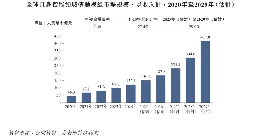 随着具身智能技术逐步落地、人形机器人进入原型研发与小批量测试阶段,对于传动模块的需求将快速释放。根据弗若斯特沙利文的资料,2024年,全球具身智能领域传动模块的市场规模达到人民币1,221亿元,2020年至2024年的年复合增长率为27.4%。随着具身智能技术的进一步发展和大规模商业化应用,人形机器人有望加速步入大规模量产,对传动模块的规模化需求也将稳定增长。根据弗若斯特沙利文的资料,2029年,全球具身智能领域传动模块的市场规模将达到人民币4,178亿元,2025年至2029年的年复合增长率将达到29.9%。