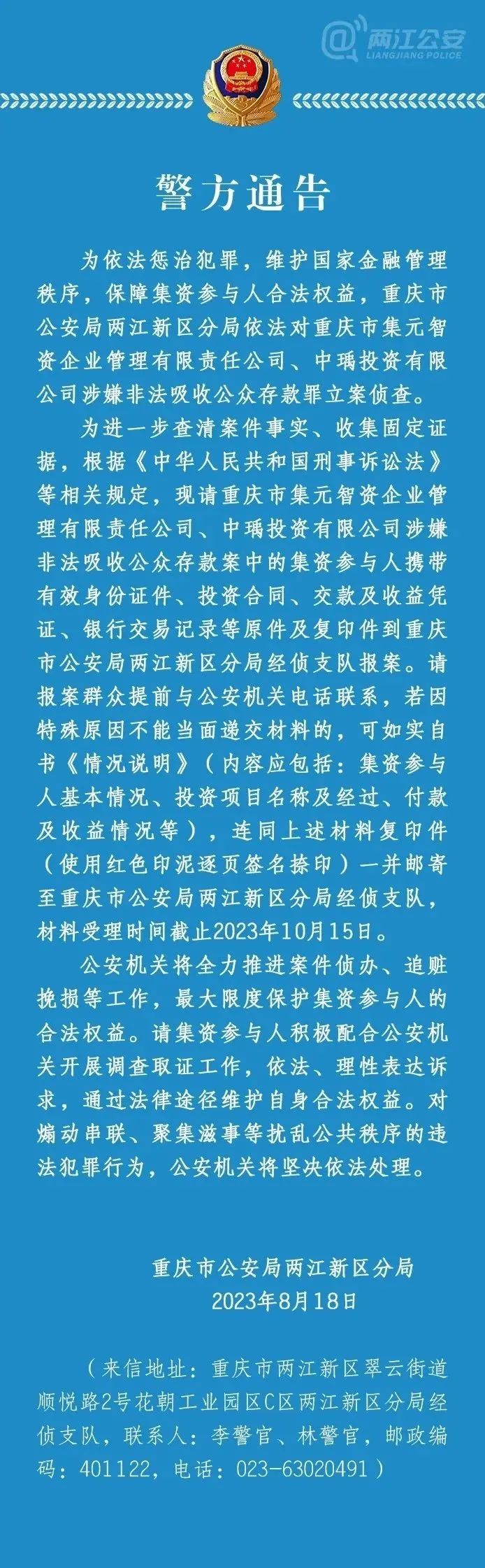 2023年8月18日,重庆市公安局两江新区分局对外发布了关于重庆市集元智资企业管理有限责任公司、中瑀投资有限公司涉嫌非法吸收公众存款案的情况通告。具体如下: