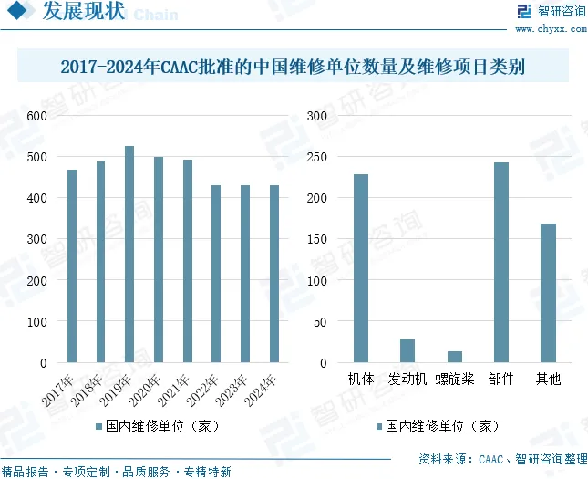 当前,我国航空航天器修理产业已形成涵盖机体定期检修、发动机深度修理及关键部件专业化维护的一体化产业链体系。随着国民经济持续健康发展,航空运输业保持高景气度,带动航空航天器定期检修与航线维护需求显著增长,行业经济效益明显提升,吸引众多新兴企业进入该领域。为确保航空安全,行业实施严格监管体系,同时民航局积极推进“多证合一”改革,通过统一各地区管理局执行标准,有效降低企业运营成本。在市场整合趋势下,部分领先企业加快资源优化配置,推动行业集中度稳步提高。截至2024年底,CAAC批准的国内维修单位数量为429家,与2023年底数量持平。其中能够从事机体维修项目有228家,能够从事发动机维修项目有28家,能够从事螺旋桨维修项目有13家,能够从事部件维修项目有243家,能够从事其他维修项目有168家,同一家维修单位可以具有多个维修项目类别。