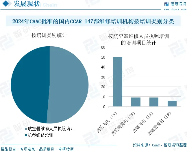 数据显示,截至2024年底,CAAC批准的国内CCAR-147部维修培训机构共96家。其中能够从事航空器维修人员执照培训业务的有59家,能够从事机型维修培训业务的有56家,同一家培训机构可以具有多个培训类别,同一个培训类别可以具有多个培训项目。在航空器维修人员执照培训方面,59家从事航空器维修人员执照培训的培训机构中,有50家从事涡轮飞机(TA)培训项目,有9家从事涡轮旋翼机(TR)培训项目,有9家从事活塞飞机(PA)培训项目,有6家从事活塞旋翼机(PR)培训项目。在机型维修培训方面,国内56家从事机型维修培训的培训机构所提供的培训业务基本能够覆盖国内在用各型运输类航空器。