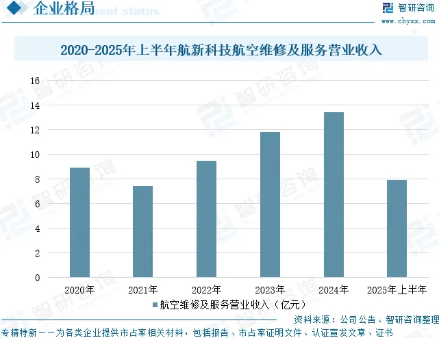 广州航新航空科技股份有限公司聚焦航空领域,围绕着“保障飞行安全”主线,为用户提供提升飞机安全性和保障性的产品及服务。经过长期的技术积累和不断创新,航新科技业务已覆盖设备研制及保障、航空维修及服务两大领域。设备研制及保障业务领域:主要涵盖机载设备研制、检测设备研制、飞机加改装业务、大数据业务、传感器业务;航空维修及服务业务领域:主要涵盖部附件维修保障、整机维修保障(包括基地维修、航线维护、飞机内饰改装和飞机喷涂)、航空资产管理业务。整机维修保障:包括基地维修、航线维护、飞机内饰改装和飞机喷涂等。目前拥有4条维修服务线和1条飞机涂装服务线,可同时满足5架窄体飞机的基地维修需求,主要维修机型A320系列和B737系列等;航线维护站主要分布在欧洲和非洲地区,可提供7×24小时不间断维护服务及部附件更换;可对飞机进行全方位的涂装设计和涂装及客舱内饰翻新与维修。据统计,2025年上半年,航新科技航空维修及服务营业收入为7.92亿元,同比增长0.89%。