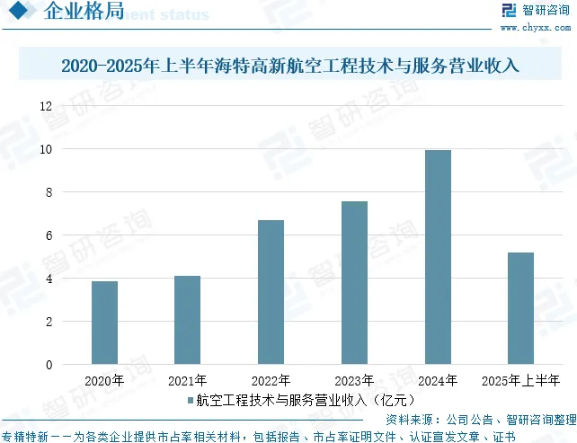 四川海特高新技术股份有限公司主营业务包括高端核心装备研制与保障、航空工程技术与服务、低空经济技术研发与应用、高性能第二代/第三代集成电路设计与制造。其中,航空工程技术与服务包括航空再制造和航空工程技术服务。在民航运输飞机方面,公司拥有美国FAA、欧洲EASA、中国CAAC等世界主要民航机构维修许可授权,服务机型包括波音B737NG系列、空客A320/A321系列,是中国最大的第三方民营飞机MRO企业,联动公司上下游产业链优势,形成航空金融、飞机大修、航线维护、退租检的完整产业链。公务机方面,拥有美国FAA、欧洲EASA、中国CAAC、开曼、阿鲁巴、百慕大、马恩岛、圣马力诺等维修许可授权,服务机型包括加拿大庞巴迪挑战者系列和环球快车系列、美国湾流系列、巴航工业世袭1000/莱格赛650/飞鸿300、达索航空猎鹰7X/8X等,同时是霍尼韦尔特许经销商及美国湾流、巴航工业、达索航空、罗罗航空发动机等主流公务机OEM厂家的维修授权服务中心,是大中华区维修范围最广、维修能力最强的公务机维修企业。据统计,2025年上半年海特高新航空工程技术与服务营业收入为5.18亿元,同比增长11.88%。