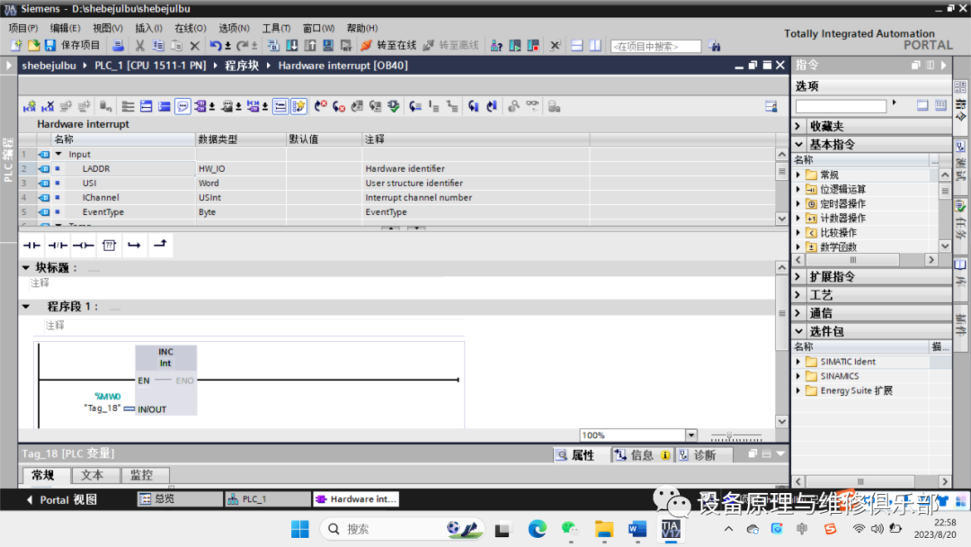 【解】①添加组织块OB40。在TIA博途软件项目视图的项目树中,双击“添加新块”,弹出如图1所示的界面,选中“组织块”和“Hardware interrupt”选项,单击“确定”按钮,即可添加OB40组织块。