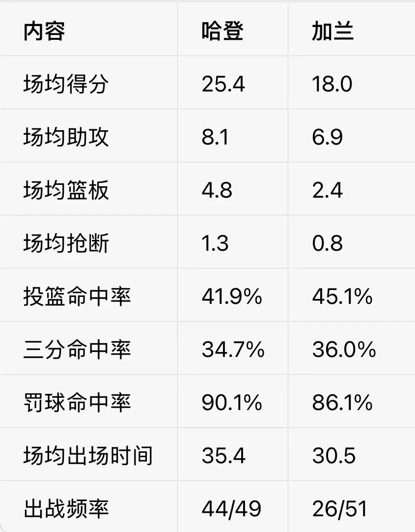 哈登的优势在于半场进攻的影响力。哈登本赛季单打每回合1.05分,全联盟第三,仅次于杜兰特和亚历山大。与此相比,加兰在高压下的进攻选择和身体承受力一直都备受大家诟病。