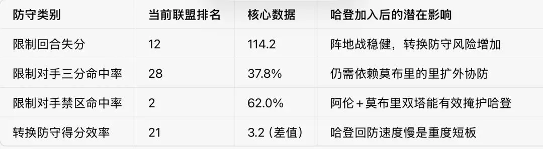 4、防守坍塌的风险:如果莫布里或者阿伦其中一人受伤,哈登在外线防守的弱环就会被无限放大。