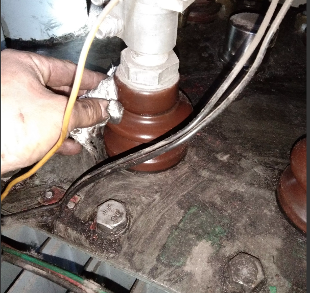 昨天巡检发现变压器漏油。今晚趁机器还没生产停电检修。变压器表面油污严重,低压侧绝缘套管有明显漏油迹象。停电放电,先用干布擦擦表层的油污,再用纸擦瓷瓶。用扳手紧紧螺丝。螺丝有点松动,可能跟网友说的一样,天冷加负荷降下来,导致冷缩。