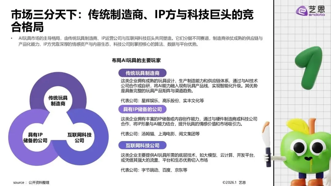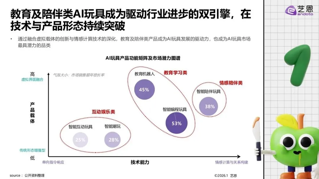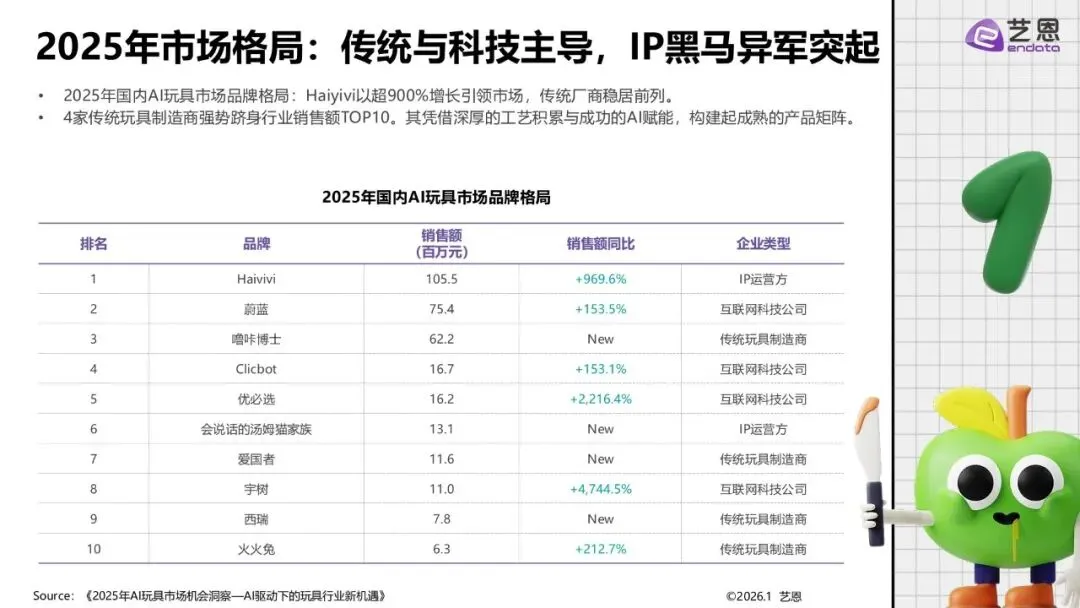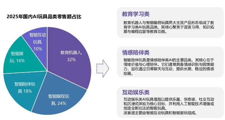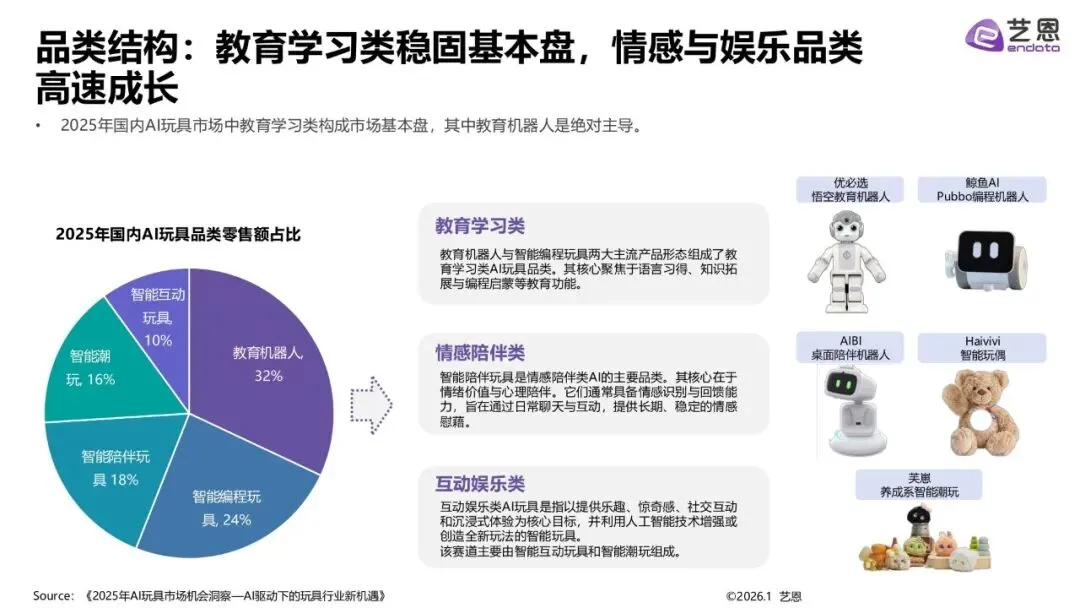 市场格局与品类结构2025年国内市场呈现“传统与科技主导,IP黑马崛起”态势,Haiyivi等IP方增长显著。品类以教育学习类(如教育机器人)为基本盘,情感陪伴类与互动娱乐类增长迅速。