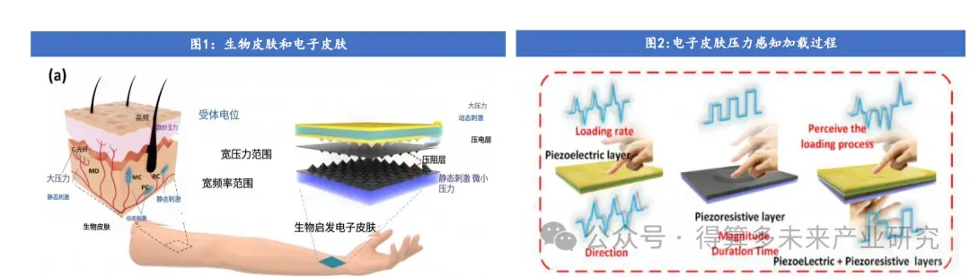 电子皮肤(E-skin):是一种能够模仿人类皮肤结构和感知功能的柔性电子系统。它不仅能让机器人“感受”到压力、温度、湿度、纹理等外界刺激,更能通过与人工智能等技术的深度融合,提升机器人的环境适应能力和智能交互水平。