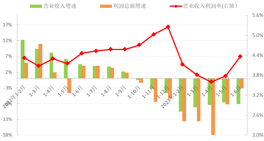 成本上涨,企业盈利难度加大。行业规模以上企业亏损面达30.38%,比上年同期扩大12.44个百分点;营业利润率为4.36%,同比增长5.43%,比1-5月提升0.58个百分点,但低于1-3月0.55个百分点。