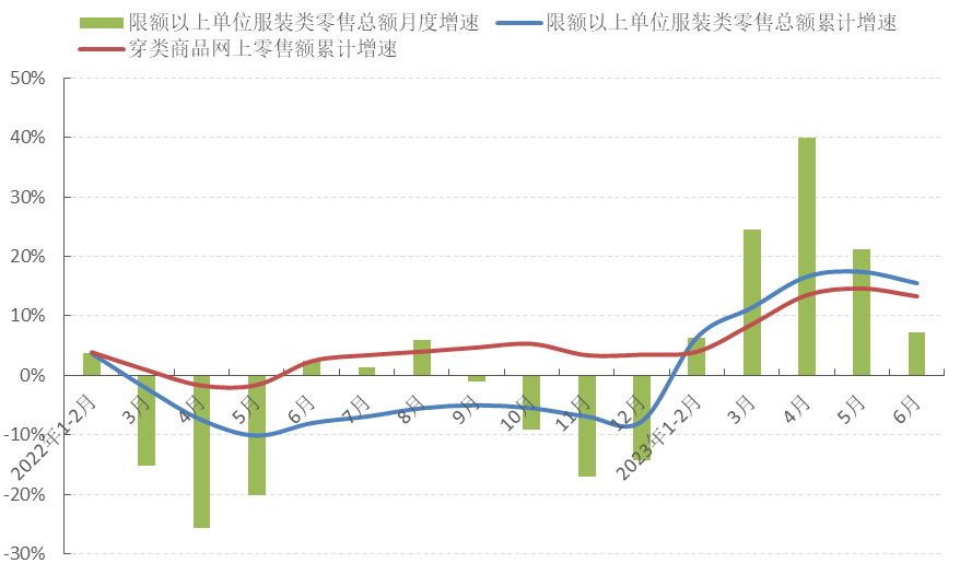 在消费方式加速转变、物流迅速恢复、市场持续下沉等有利因素的支撑下,服装线上零售增长明显加快。1-6月,穿类商品网上零售额同比增长13.3%,增速比2022年全年加快9.8个百分点,比1-3月加快4.7个百分点。同时,穿类商品网上零售增速明显快于吃类和用类商品,吃类和用类商品的网上零售额增速分别为8.9%和10.3%。