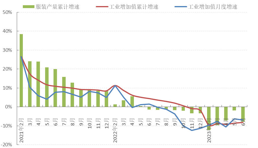 上半年,受市场需求复苏乏力的影响,春季传统旺季订单低于预期,二季度订单不足问题更为突出,行业生产增速持续回落,规模以上企业工业增加值和服装产量均呈现负增长,降幅较2022年继续加深。