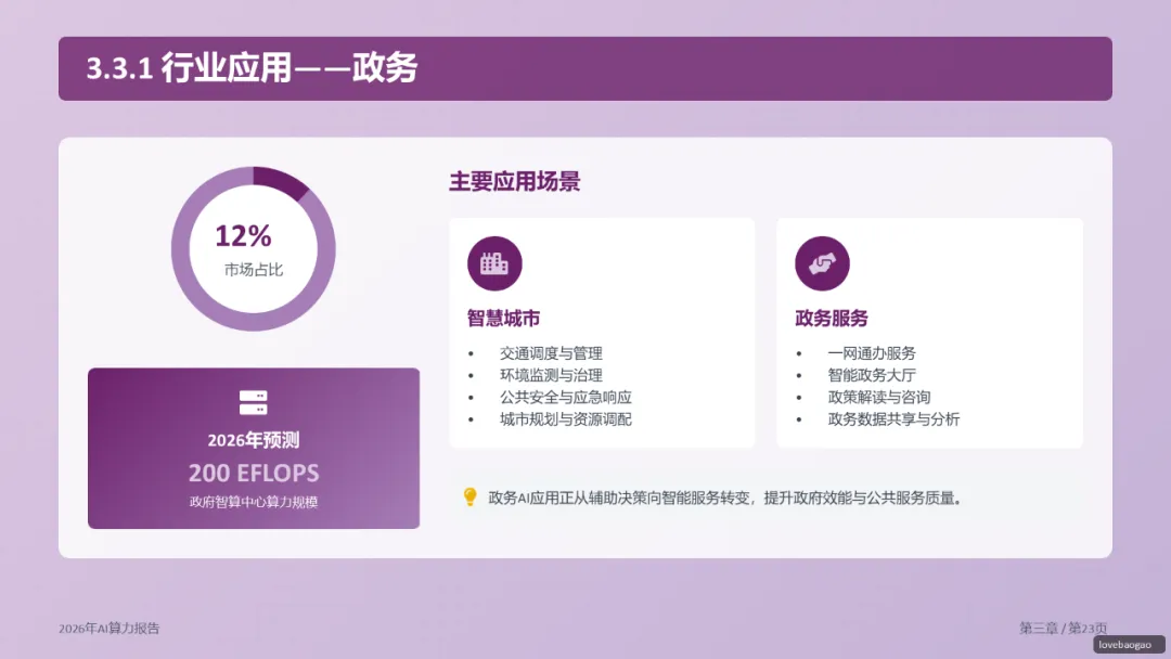 2025 年排名第四,算力应用覆盖智能质检、生产优化、供应链管理,中国制造业 AI 渗透率达 40%,带动边缘算力需求增长。 - 政府与运营商