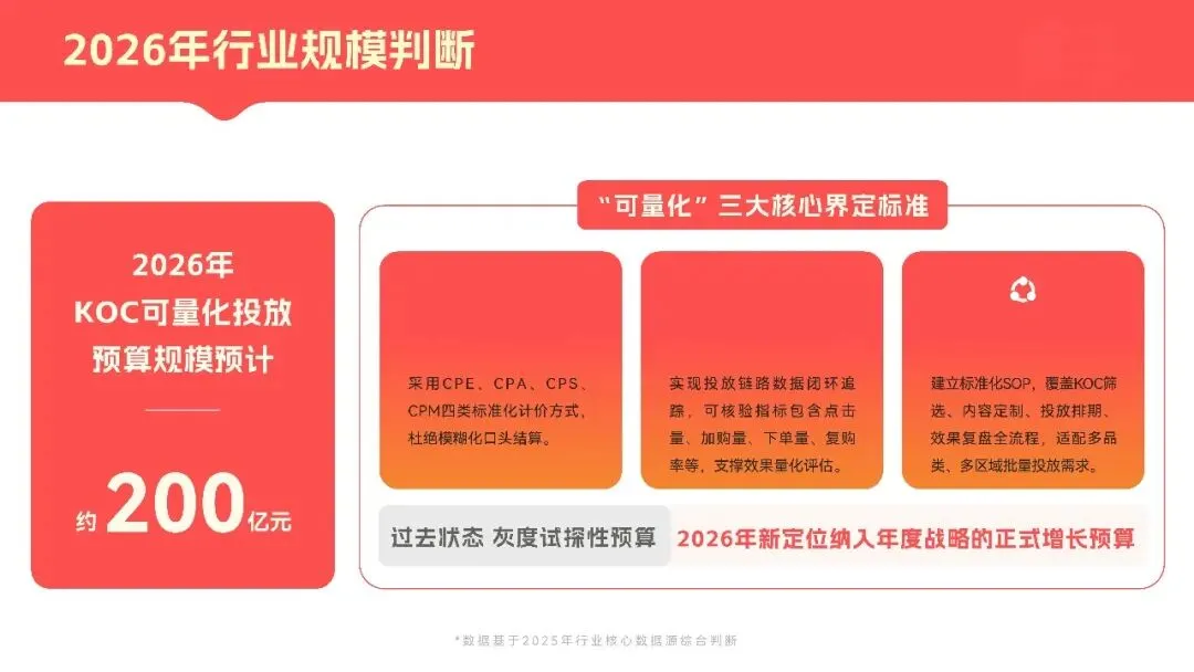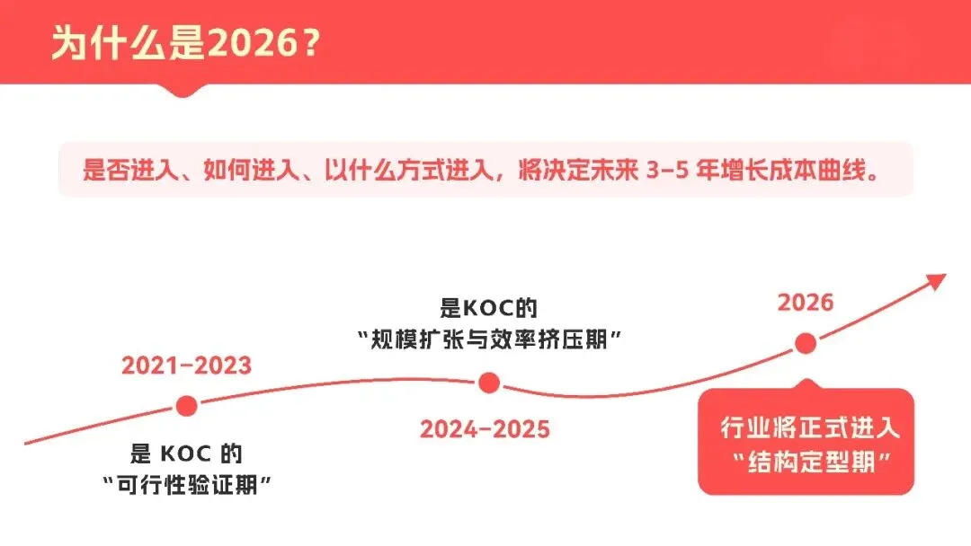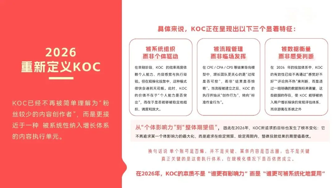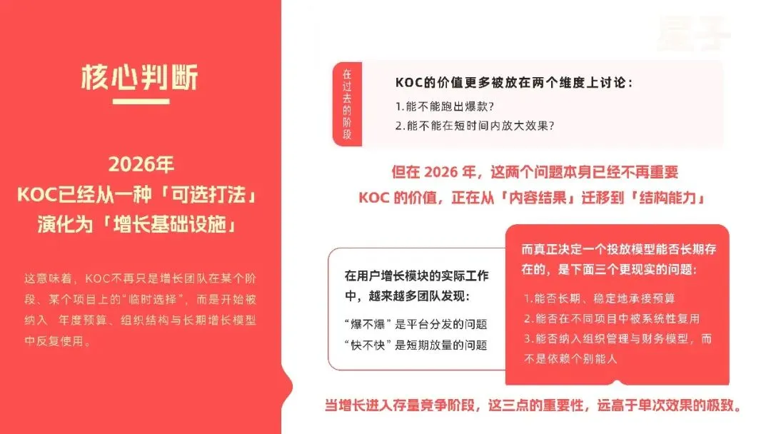 2026年KOC已经从一种「可选打法』演化为「增长基础设施」这意味着,KOC不再只是增长团队在某个阶段、某个项目上的“临时选择”,而是开始被纳入年度预算、组织结构与长期增长模型中反复使用。