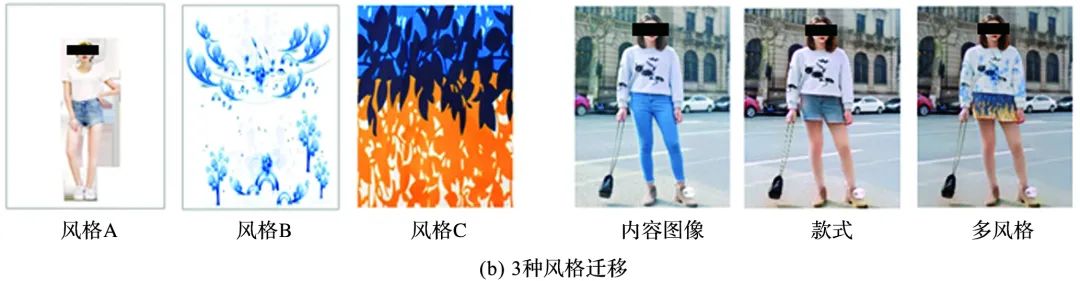 如图5(a)所示,前两行展示的是将内容域中长裤的形状转换为与风格域A中短裤相似的样式。同理,后面两行图像是将长裤转换为裙子,并将风格域中的图案纹理分别融合在上装和下装中。不管是样式形状迁移还是图案纹理迁移,都获得了较好的生成效果。值得注意的是,转换所生成的裙子的色彩与风格域A无关,与输入的内容域有关,如内容域中服装色彩较深的往往转换为颜色较深的服装款式。风格域A所展示的图像仅仅只是一种样式(如裙子的样式)的代表,并非单个样式形状迁移。此外,在完成款式风格迁移后还可将对上装和下装同时进行图案的风格迁移,由图5(b)可见,将风格A、风格B和风格C的3种风格混搭在同一张服装图像中,生成了效果真实、新颖独特的服装图像。当然,这还需要根据不同图案来设置好式(6)中的参数。