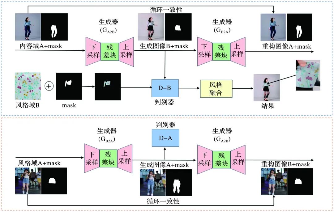 为实现服装图像的混搭风格迁移,利用CycleGAN不需要成对训练数据集和风格迁移效果好的优势,本研究通过结合分割掩码改进CycleGAN网络结构和损失函数,完成服装图像中下装的几何变换。同时,为了将图案更好地融入服装局部,提出图案融合的方法,增强图像真实感而非艺术效果,对服装图像分割后获得的分割掩码与图案按照一定权值融合。