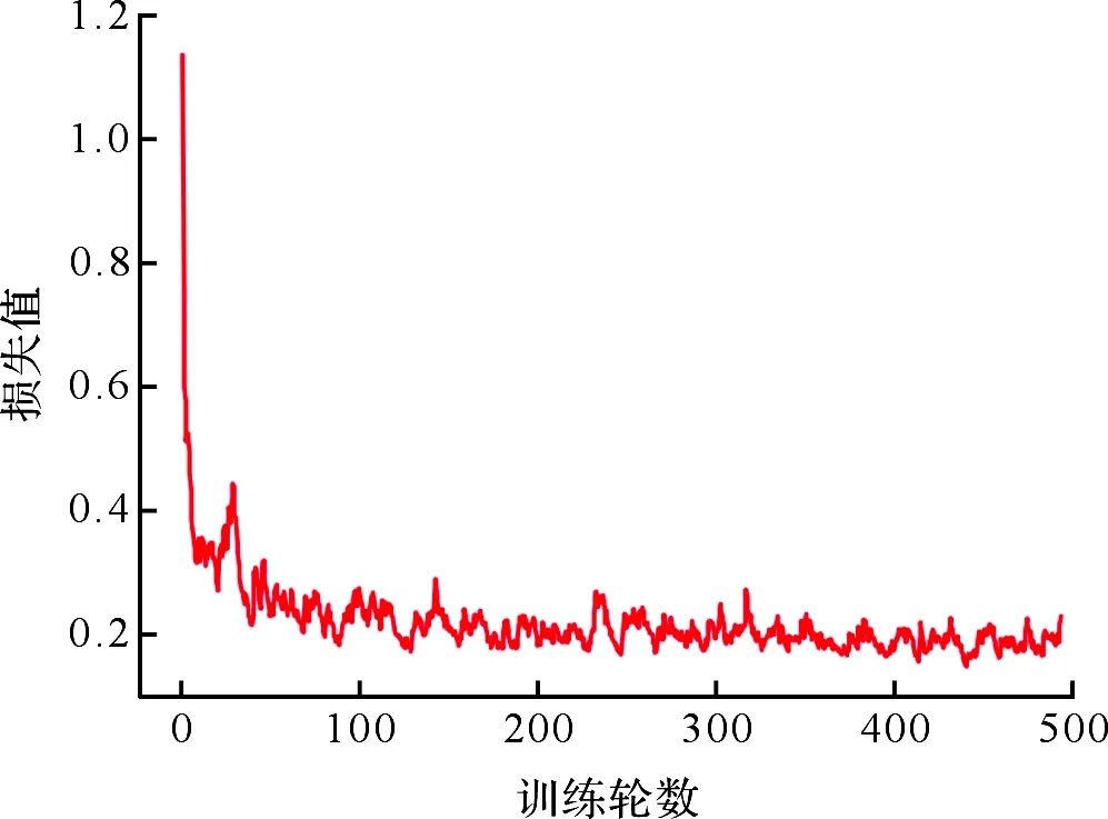 实验环境与模型训练:CUDA 11.3,cuDNN 8,Ubuntu 18.04系统,Pytorch 1.10深度学习框架,Python 3.8程序语言,NVIDIA GeForce RTX 3090显存24 GB的显卡。共训练了500轮,训练过程中损失的变化如图4所示。由于在训练200轮次后损失下降幅度减小甚至难以继续下降,因此,选择了200轮次的预训练模型进行测试。