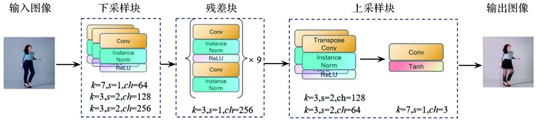 上述方法主要局限包括:单一风格迁移的研究(仅对图案或者服装款式进行风格迁移),极大地限制了生成服装图像的多样性;在带有背景的服装图像中,容易产生图像局部细节失真的问题。为了克服上述两大缺陷,降低自动生成多风格服装图像的难度,本文基于CycleGAN的结构提出一种服装图像的混搭风格迁移方法。与以往生成单一风格形式的模型相比,有三点不同:首先本文提出混搭风格迁移,即关注于服装款式和服装图案的多风格迁移;其次,改进了CycleGAN网络结构用于多风格图像的生成;最后,加入了背景优化损失,结合引入的服装图像二值图,提升生成图像的质量。另外,通过使用图像评估指标IS(Iception Score)[17]和SSIM(Structural similarity)[18]对CycleGAN和InstaGAN进行比较,并结合生成的图像效果进行主客观分析,以验证本文方法的有效性。