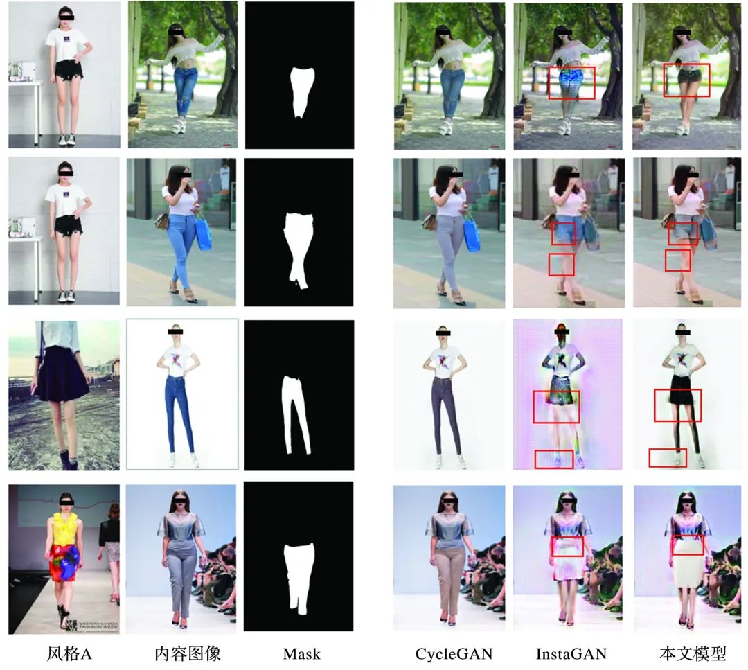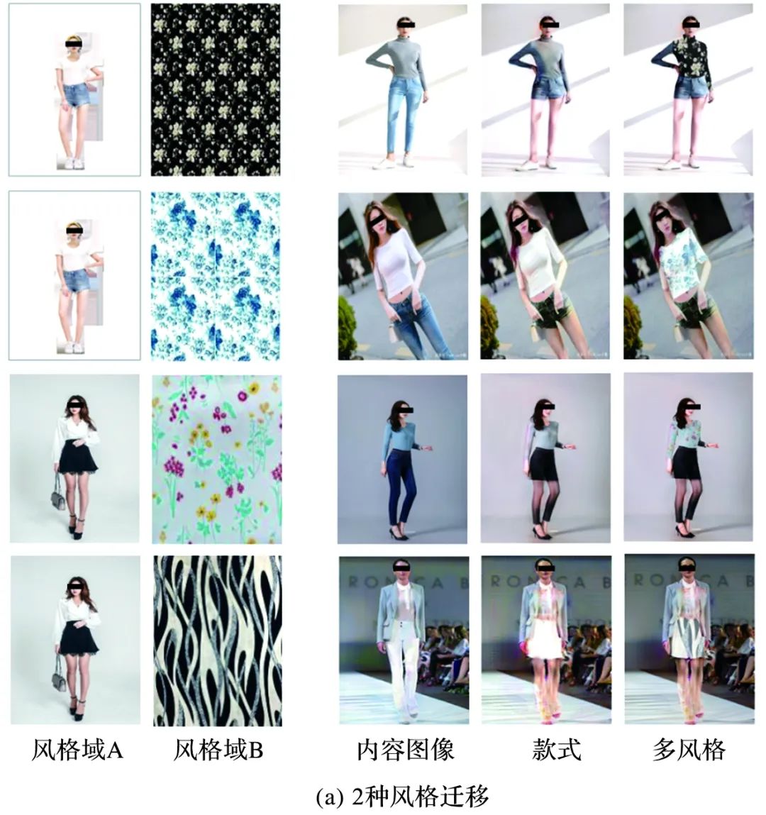本文主要针对服装图像进行款式和图案纹理的风格迁移。在实验中,一方面将风格域A中的服装样式(短裤或者裙子)迁移至内容域的下装,并将风格域B的图案纹理迁移至内容域的上装;另一方面通过选择有人物背景的作为内容域,在风格迁移后,通过人物背景作为参考,可以更加直观展示风格迁移效果,如不同图案款式对不同人群搭配的适应性。