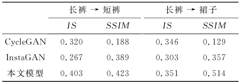 为了验证本文方法在款式风格迁移的有效性,将本文基于CycleGAN所提的方法与CycleGAN和InstaGAN进行主客观的比较与分析,包括在相同数据集上不同方法生成的图像效果、图像生成指标IS和图像质量评估指标SSIM。