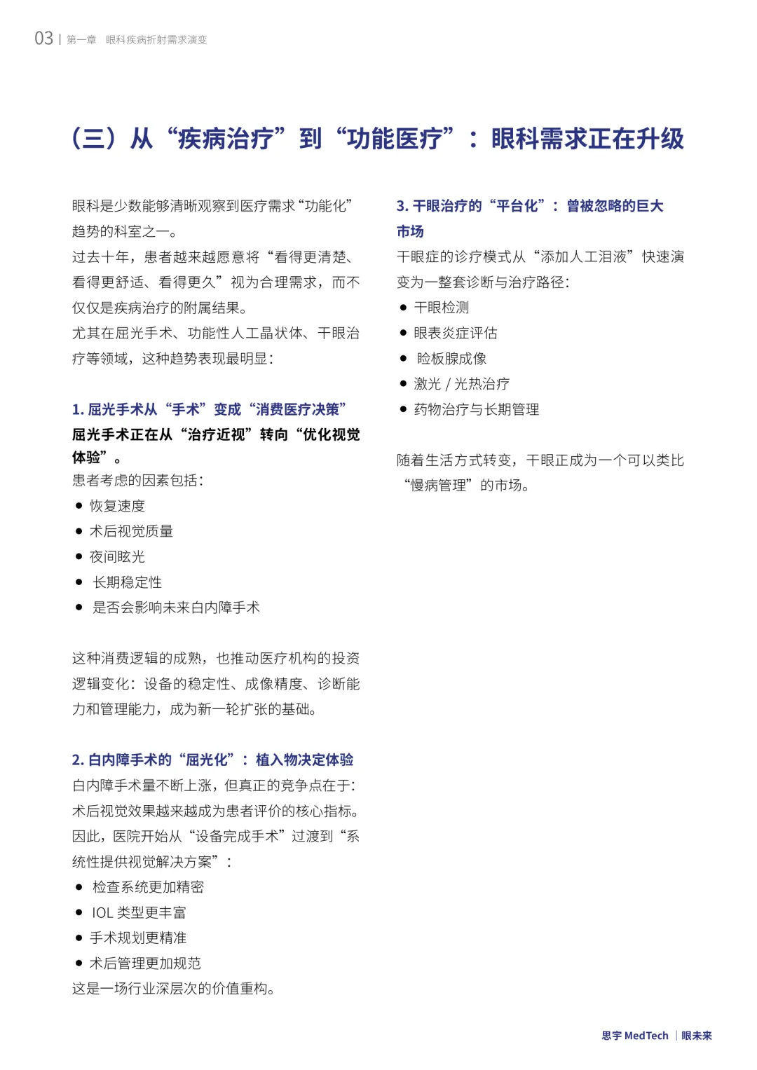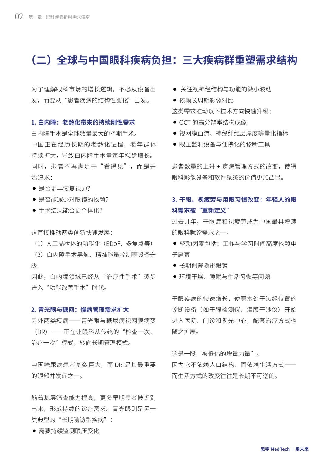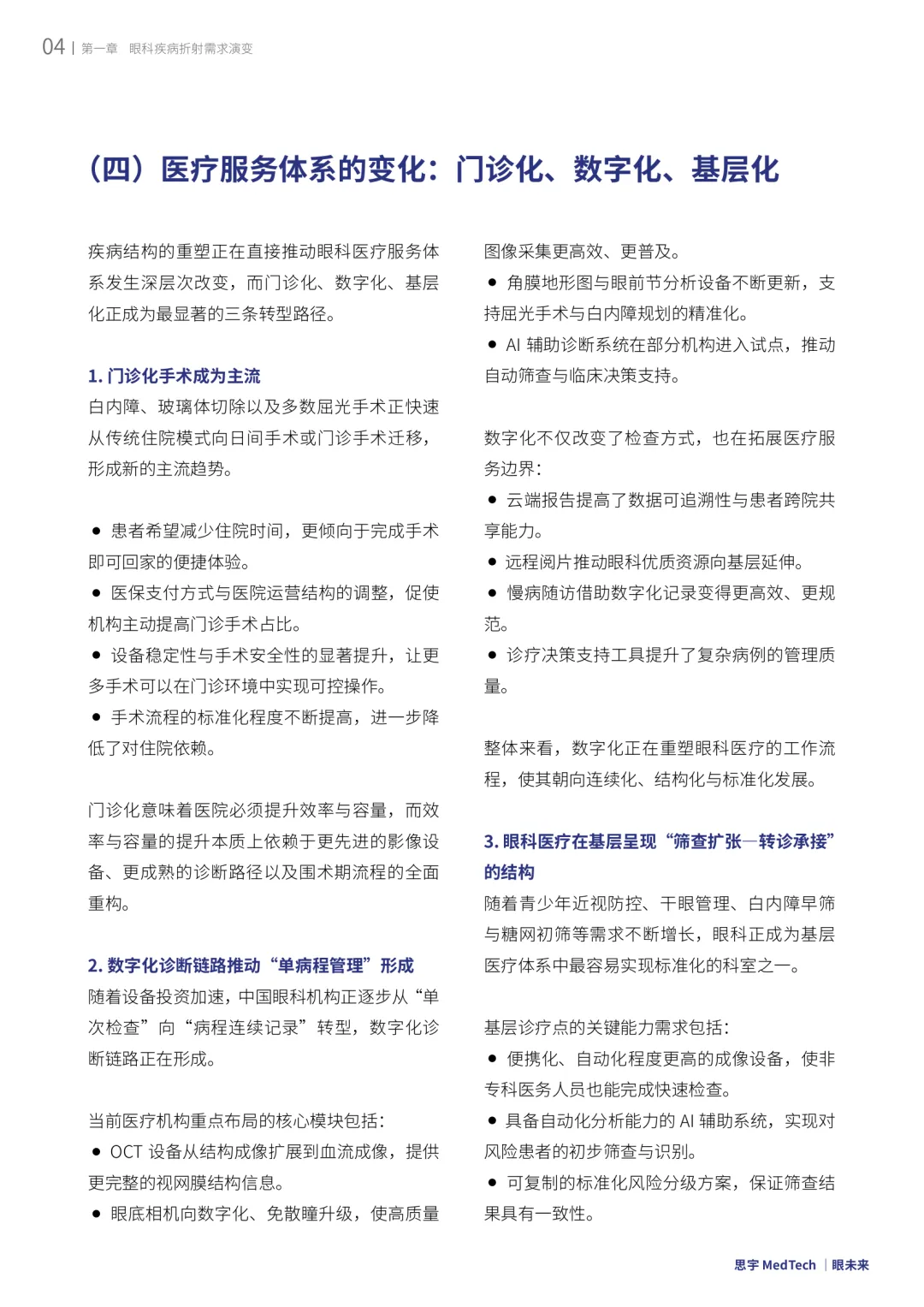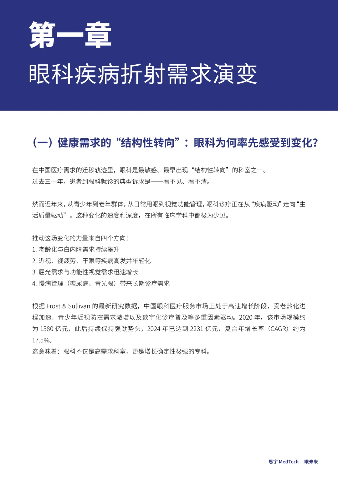 眼科领域正经历深刻的需求结构变化,这种转变在所有临床学科中尤为显著。过去,患者就诊眼科的主要原因是视力障碍或疾病导致的视觉问题。如今,随着社会结构和生活方式的变化,眼科诊疗逐渐从“疾病驱动”转向“生活质量驱动”,覆盖人群从青少年到老年人,涉及范围从基础视力矫正到复杂的视觉功能管理。推动这一变化的因素主要包括:老龄化带来的白内障需求增加、近视、视疲劳和干眼等常见病的高发与年轻化趋势、屈光矫正及功能性视觉需求的增长,以及慢性病如糖尿病和青光眼对长期诊疗的持续影响。这些因素共同促使眼科医疗服务市场快速增长,2024年市场规模已达到2231亿元,较2020年的1380亿元增长显著,复合年增长率约为17.5%。这表明,眼科不仅是一个高需求专科,更是一个具有高度增长潜力的领域。