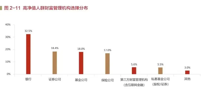 高净值人群选择财富管理机构时以国有大行为主,亦通过股份制银行、外资银行等获取特定领域的专业服务。