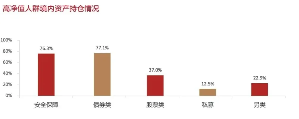 高净值人群持仓数据显示,77.1% 配置了债券类资产,表明控制波动是当前的优先财务目标;76.3% 配置了安全保障类资产,确保了资产组合的流动性和保障能力,二者共同构成了资产配置的主体。