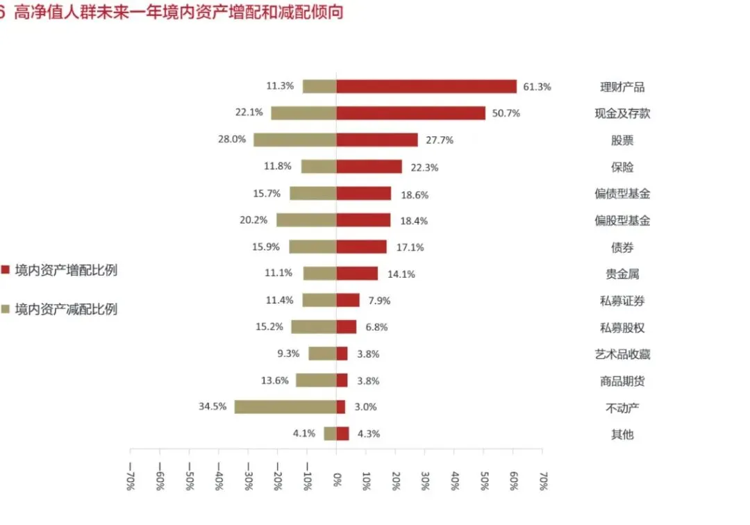 6. 境内稳健为先。理财、存款、保险为基石;超半数计划增持理财与现金,分歧于股票,减配不动产等非金融资产。