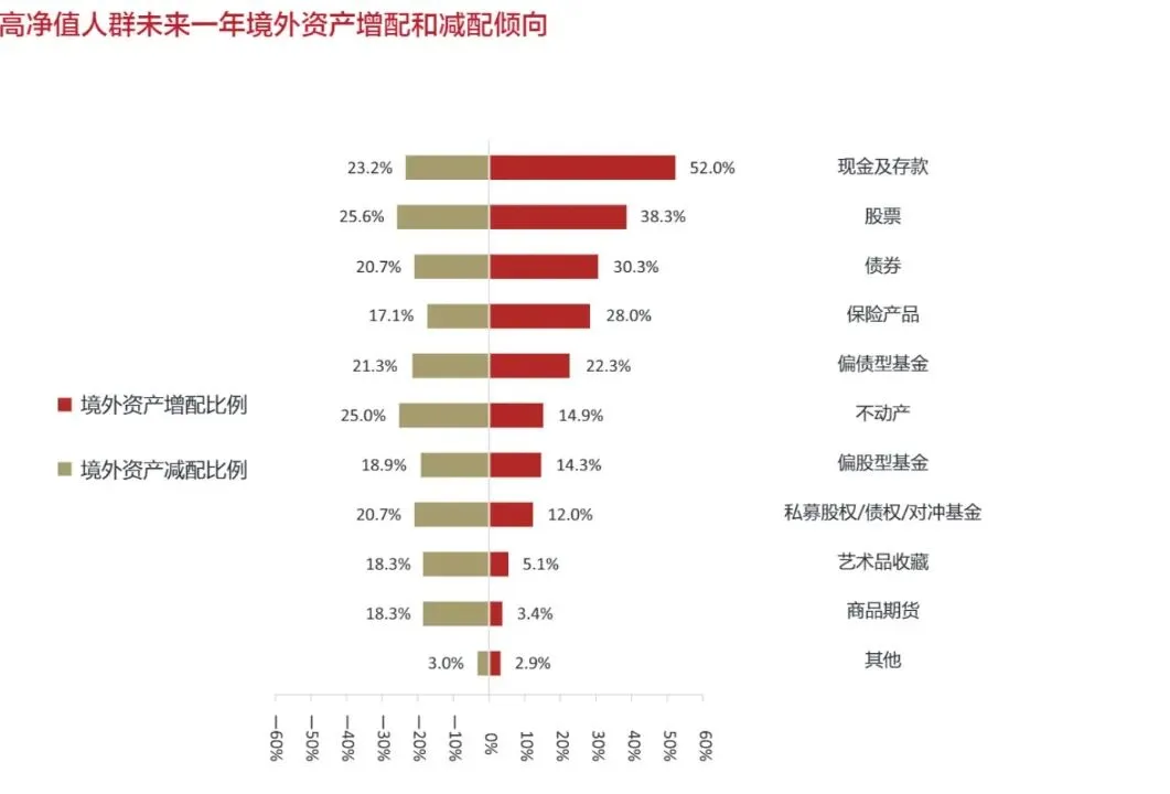 基础性增持:现金类资产的战略地位。在境外配置中,增配现金及存款的比例(52.0%)是减配比例(23.2%)的两倍。现金和存款成为高净值人群全球策略的起点和基础。既有流动性,又可防范风险,还能随时捕捉跨境机会。