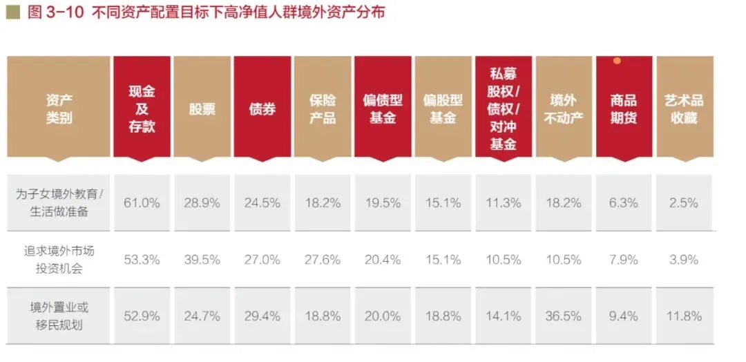 境外置业或移民规划目标下,选择不动产(36.5%)、艺术品(11.8%)等另类资产的高净值人群比例显著高于其他目标下的相应水平。