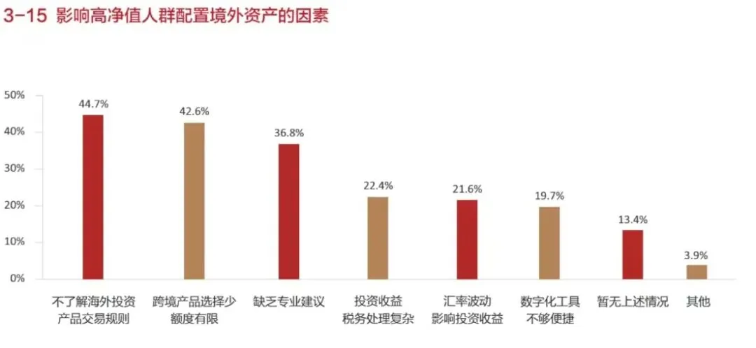 跨境资产配置过程中,高净值人群的最大顾虑是不了解境外投资产品规则,同时,优质产品供给有限、专业建议供给不足的提及率均超三成,三大问题共同构成跨境配置的主要痛点。