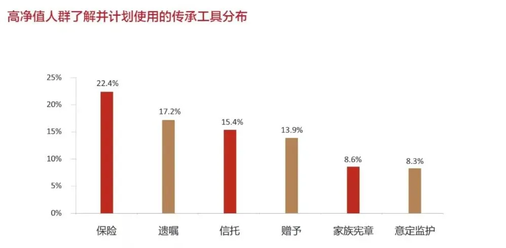 当前,保险成为主要传承工具之一。调研结果显示,使用范围最广的传承工具是保险,35.7% 的高净值人群实际使用了保险,同时还有 22.4% 的高净值人群正处于了解与计划使用的阶段。