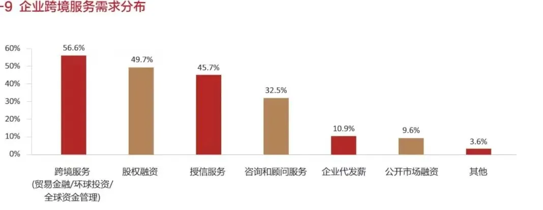 调研结果显示,56.6% 的受访企业家有贸易金融、环球投资和全球资金管理等企业跨境服务需求。