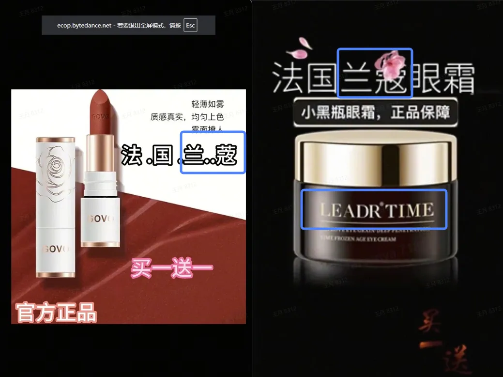 - 商品端(商家):标题、主图、详情页等位置的品牌信息必须统一,不能出现 “暗示为A品牌、实际卖B品牌”、“遮挡品牌 LOGO”“用变形词 / 近似词误导品牌理解(如‘兰蔻’写成‘兰蔲’)。
