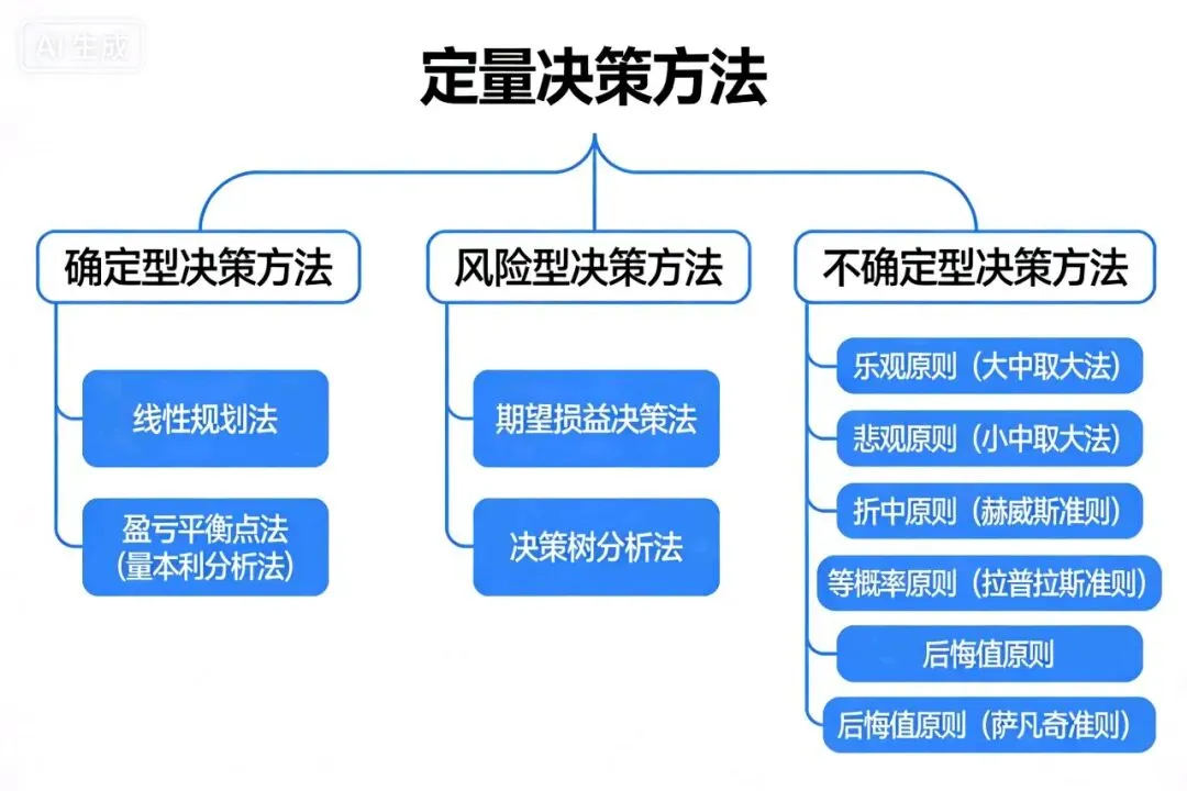 1.确定型决策方法:线性规划法;盈亏平衡点法。