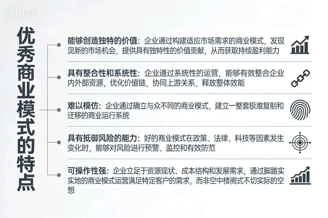 ->能够创造独特的价值:企业通过构建适应市场需求的商业模式,发现新的市场机会,提供具有独特性馆价值贡献,从而获取持续盈利能力