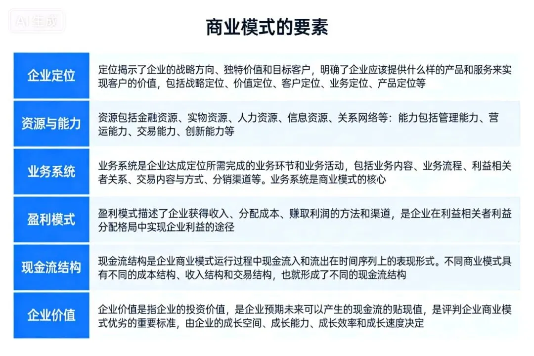概念:为实现客户价值最大化,企业整合内外部生产要素、搭建业务体系、推动建立合作伙伴关系,形成的具有独特核心竞争力的高效运行系统,该系统通过最优实现形式满足客户需求,实现企业长期可持续盈利的目标。
