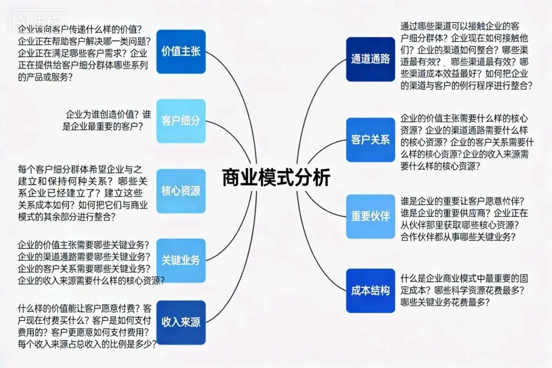 ->关键业务:企业的价值主张需要哪些关键业务?企业的渠道通路需要哪些关键业务?企业的客户关系需要哪些关键业务?企业的收入来源需要哪些关键业务?