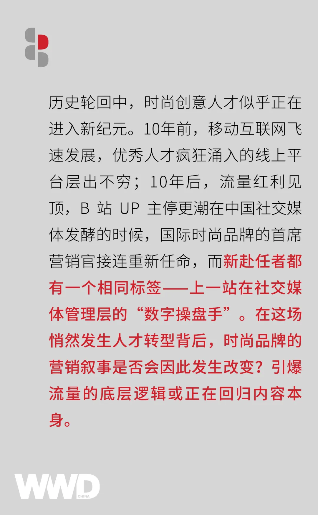 哈佛商学院的 Michael E.Porter 教授曾说:“当我们谈战略的时候,没有一个战略是自发而生的。也就是说,应变才是王道。”毫无疑问,数字化发展对于时尚品牌的未来是重中之重。时尚品牌对于社交媒体高管人才的引进,不只是短期的流量困境破解手段,更是长效的品牌动势能增长方法论。而对于这些高管来说,如何把握好数字化与内容价值之间的平衡,是一个长远的命题。WWD