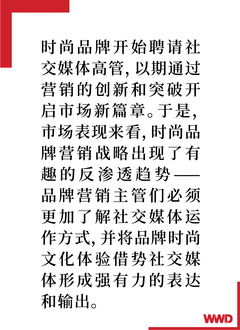 于是,时尚品牌开始聘请社交媒体高管,以期通过营销的创新和突破开启市场新篇章。于是,市场表现来看,时尚品牌营销战略出现了有趣的反渗透趋势——品牌营销主管们必须更加了解社交媒体运作方式,并将品牌时尚文化体验借势社交媒体形成强有力的表达和输出。由于消费者与品牌之间的关系不断发展,社交媒体成为其沟通的重要桥梁,因此,为消费者留下持续、深刻的品牌烙印比以往任何时刻都更为重要。