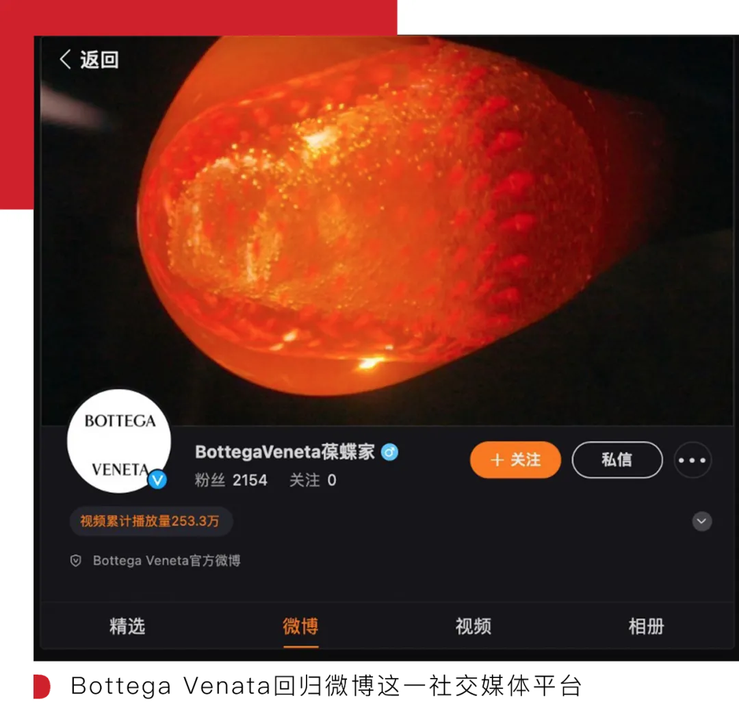 今年年初,两年前悄然离开微博的 Bottega Veneta,重新回归了这一社交媒体平台。在品牌前创意总监 Daniel Lee 执政期间,Bottega Venata 于2022 年 1 月在所有主流社交媒体平台上均陷入黑暗,包括 Instagram、Twitter、Facebook 和微博。虽然开云董事长兼首席执行官 François Henri Pinault 在当时解释道:“关于数字通信战略,它并没有从社交网络消失,只是以不同的方式使用它们。”但日前品牌官方微博的复出或许标志着品牌数字化营销战略的转变,这可能有助于品牌在社媒的助推下获得更广泛的知名度,并与消费者实现长效、稳定的沟通联结。