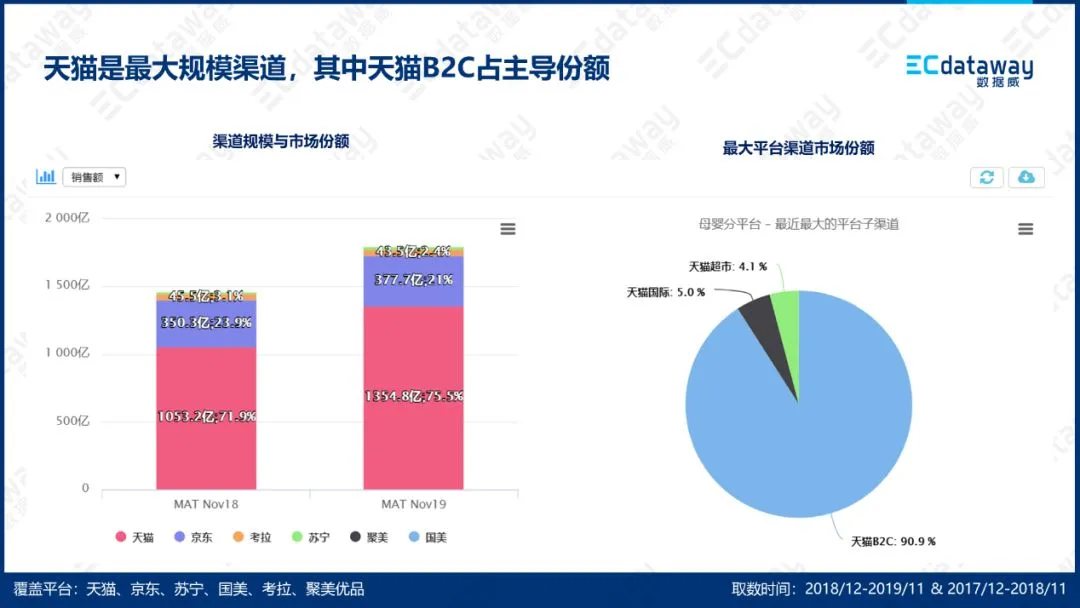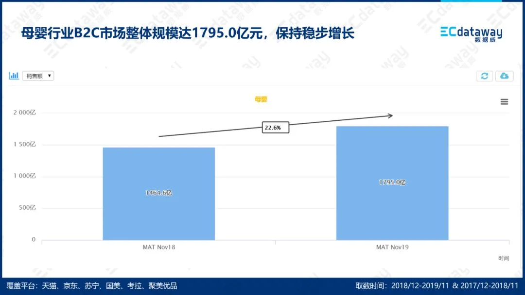 来自电商数据服务专家ECdataway数据威的数据显示,MAT11月2019年主流B2C电商平台,母婴行业整体市场规模达1,795.0亿元,销售额同比增速22.6%,保持稳步增长。