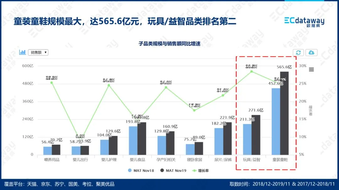 看过了母婴行业整体趋势,我们再来进一步研究其子品类又有怎样的表现。如上图所示,童装童鞋依旧是母婴行业最大规模子品类,MAT2019规模达565.6亿元,占31.5%市场份额。而玩具/益智类市场规模排名第二,其销售额同比增速达28.5%,领跑母婴行业其他品类。
